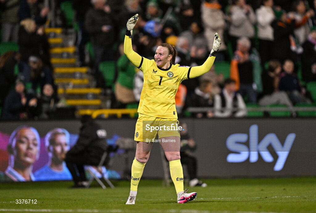 3 March 2026; Republic of Ireland goalkeeper Courtney Brosnan celebrates her side's first goal scored by Katie McCabe, not pictured, during the 2027 FIFA Women’s World Cup Qualifier match between Republic of Ireland and France at Tallaght Stadium in Dublin. Photo by Sam Barnes/Sportsfile