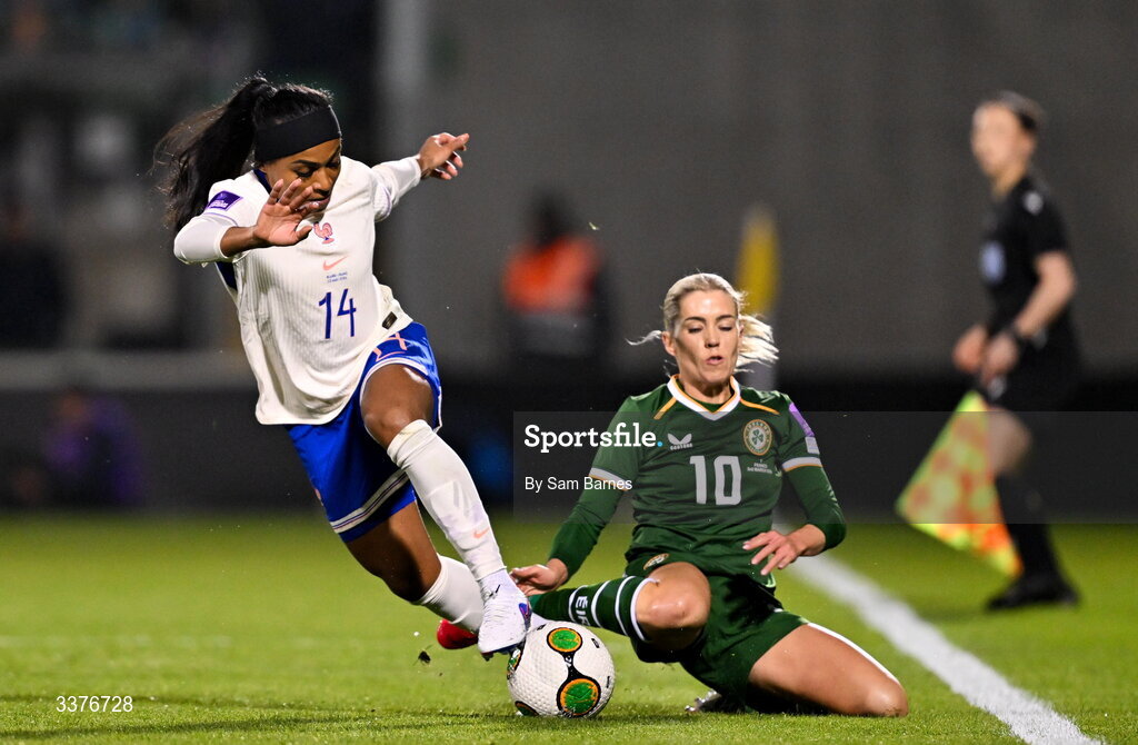 3 March 2026; Perle Morroni of France in action against Denise O’Sullivan of Republic of Ireland during the 2027 FIFA Women’s World Cup Qualifier match between Republic of Ireland and France at Tallaght Stadium in Dublin. Photo by Sam Barnes/Sportsfile