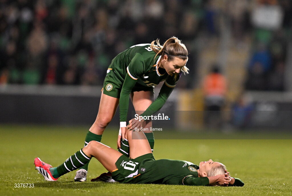 3 March 2026; Denise O’Sullivan of Republic of Ireland is checked on by teammate Kyra Carusa during the 2027 FIFA Women’s World Cup Qualifier match between Republic of Ireland and France at Tallaght Stadium in Dublin. Photo by Sam Barnes/Sportsfile