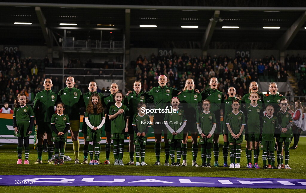 3 March 2026; Republic of Ireland players line up for Amhrán na bhFiann before the 2027 FIFA Women’s World Cup Qualifier match between Republic of Ireland and France at Tallaght Stadium in Dublin. Photo by Stephen McCarthy/Sportsfile