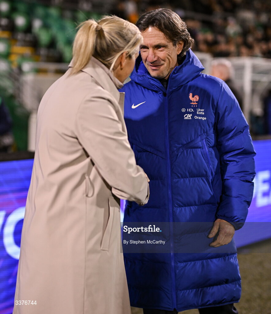 3 March 2026; France head coach Laurent Bonadei shakes hands with Republic of Ireland head coach Carla Ward before the 2027 FIFA Women’s World Cup Qualifier match between Republic of Ireland and France at Tallaght Stadium in Dublin. Photo by Stephen McCarthy/Sportsfile