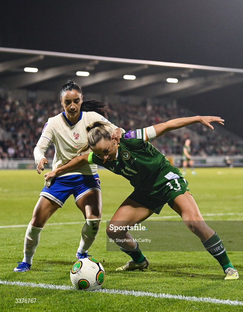 3 March 2026; Katie McCabe of Republic of Ireland in action against Sakina Karchaoui of France during the 2027 FIFA Women’s World Cup Qualifier match between Republic of Ireland and France at Tallaght Stadium in Dublin. Photo by Stephen McCarthy/Sportsfile