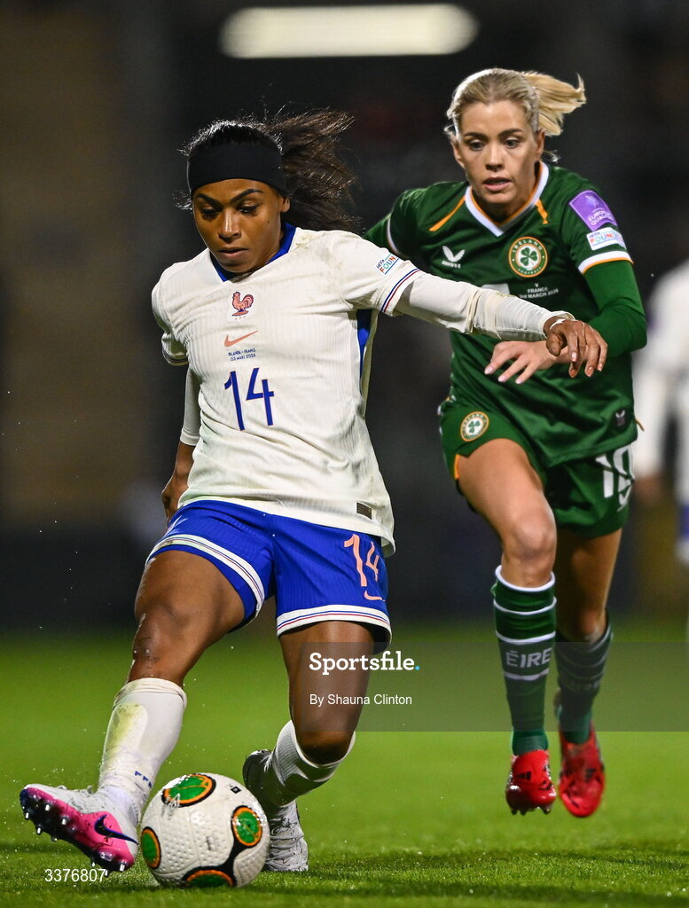 3 March 2026; Perle Morroni of France in action against Denise O'Sullivan of Republic of Ireland during the 2027 FIFA Women’s World Cup Qualifier match between Republic of Ireland and France at Tallaght Stadium in Dublin. Photo by Shauna Clinton/Sportsfile