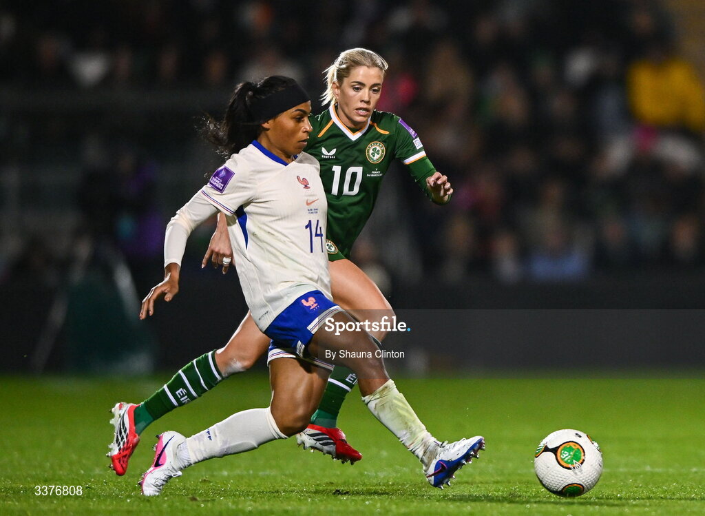 3 March 2026; Perle Morroni of France in action against Denise O'Sullivan of Republic of Ireland during the 2027 FIFA Women’s World Cup Qualifier match between Republic of Ireland and France at Tallaght Stadium in Dublin. Photo by Shauna Clinton/Sportsfile