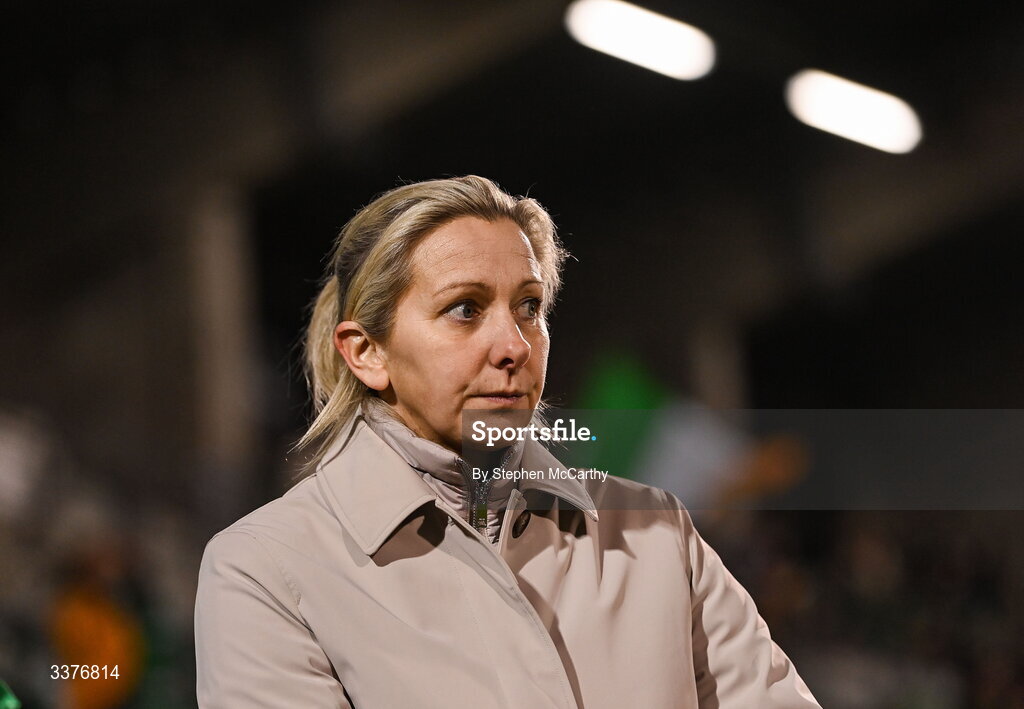 3 March 2026; Republic of Ireland head coach Carla Ward looks on before the 2027 FIFA Women’s World Cup Qualifier match between Republic of Ireland and France at Tallaght Stadium in Dublin. Photo by Stephen McCarthy/Sportsfile