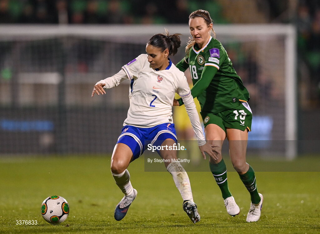 3 March 2026; Maëlle Lakrar of France in action against Kyra Carusa of Republic of Ireland during the 2027 FIFA Women’s World Cup Qualifier match between Republic of Ireland and France at Tallaght Stadium in Dublin. Photo by Stephen McCarthy/Sportsfile