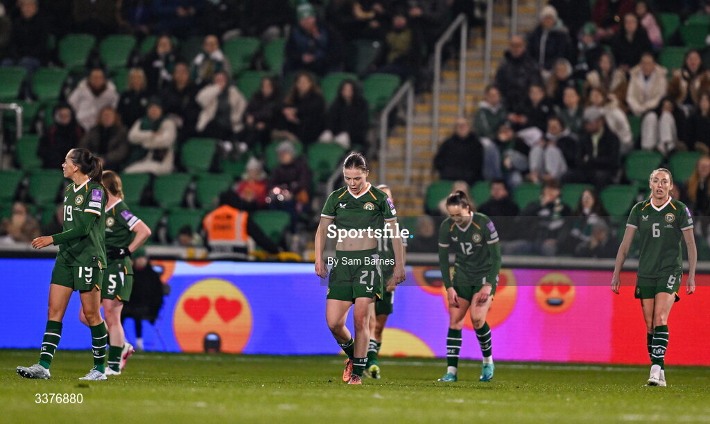 3 March 2026; Emily Murphy of Republic of Ireland and teammates react to conceding their side's second goal during the 2027 FIFA Women’s World Cup Qualifier match between Republic of Ireland and France at Tallaght Stadium in Dublin. Photo by Sam Barnes/Sportsfile