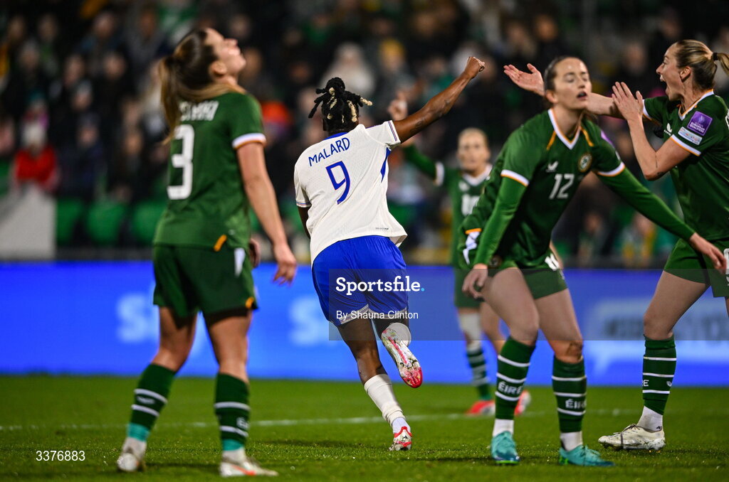 3 March 2026; Melvine Malard of France celebrates after scoring her side's second goal during the 2027 FIFA Women’s World Cup Qualifier match between Republic of Ireland and France at Tallaght Stadium in Dublin. Photo by Shauna Clinton/Sportsfile