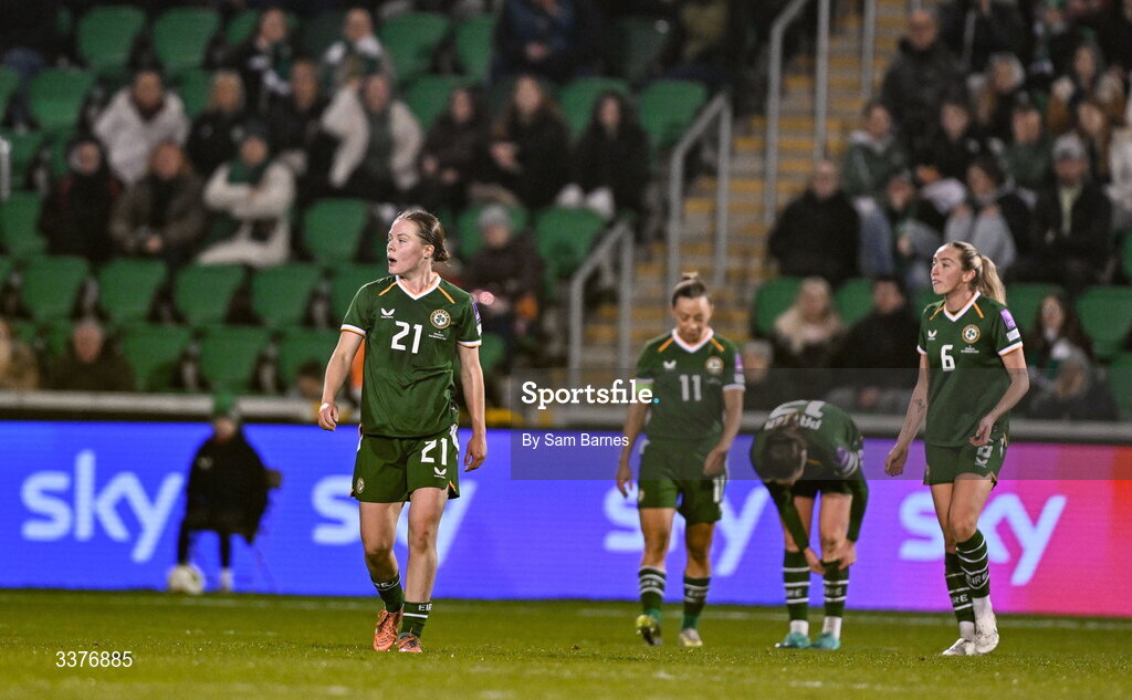 3 March 2026; Emily Murphy of Republic of Ireland and teammates react to conceding their side's second goal during the 2027 FIFA Women’s World Cup Qualifier match between Republic of Ireland and France at Tallaght Stadium in Dublin. Photo by Sam Barnes/Sportsfile