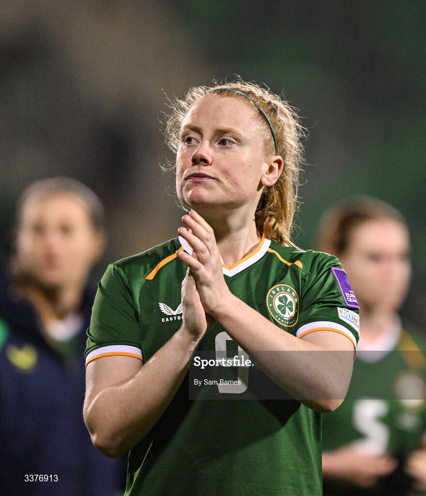 3 March 2026; Amber Barrett of Republic of Ireland applauds supporters after her side's defeat in the 2027 FIFA Women’s World Cup Qualifier match between Republic of Ireland and France at Tallaght Stadium in Dublin. Photo by Sam Barnes/Sportsfile
