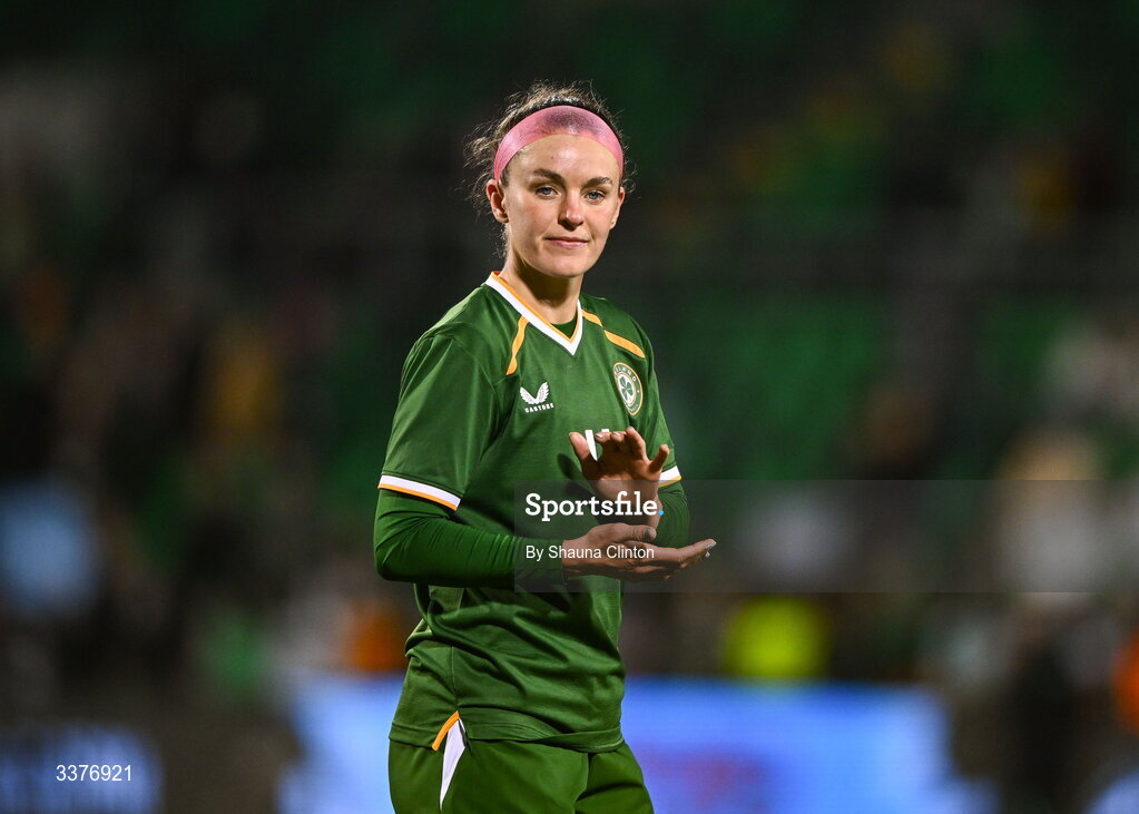 3 March 2026; Caitlin Hayes of Republic of Ireland applauds supporters after her side's defeat in the 2027 FIFA Women’s World Cup Qualifier match between Republic of Ireland and France at Tallaght Stadium in Dublin. Photo by Shauna Clinton/Sportsfile