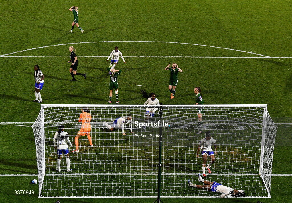 3 March 2026; Republic of Ireland and France players react after Denise O’Sullivan of Republic of Ireland has a shot on goal cleared off the line by Marie-Antoinette Katoto of France during the 2027 FIFA Women’s World Cup Qualifier match between Republic of Ireland and France at Tallaght Stadium in Dublin. Photo by Sam Barnes/Sportsfile