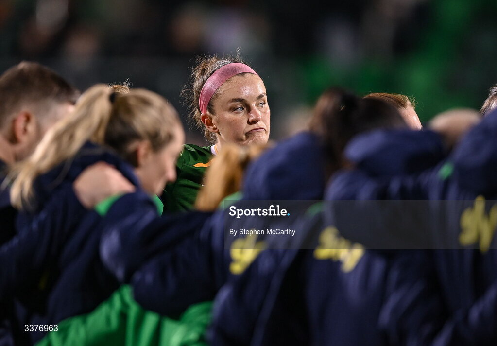 3 March 2026; Caitlin Hayes of Republic of Ireland in the huddle after her side's defeat in the 2027 FIFA Women’s World Cup Qualifier match between Republic of Ireland and France at Tallaght Stadium in Dublin. Photo by Stephen McCarthy/Sportsfile