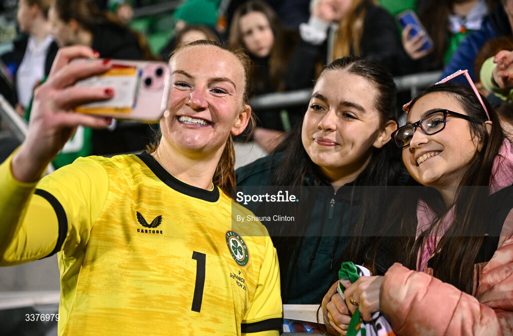 3 March 2026; Republic of Ireland goalkeeper Courtney Brosnan with Republic of Ireland supporters after the 2027 FIFA Women’s World Cup Qualifier match between Republic of Ireland and France at Tallaght Stadium in Dublin. Photo by Shauna Clinton/Sportsfile