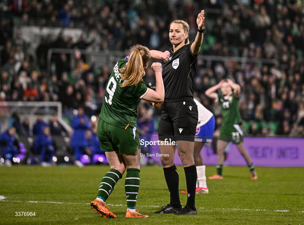3 March 2026; Amber Barrett of Republic of Ireland appeals for handball to Referee Tess Olofsson during the 2027 FIFA Women’s World Cup Qualifier match between Republic of Ireland and France at Tallaght Stadium in Dublin. Photo by Sam Barnes/Sportsfile