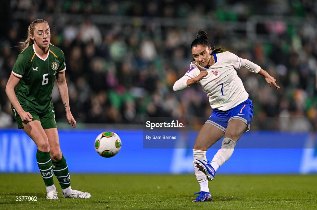 3 March 2026; Sakina Karchaoui of France in action against Megan Connolly of Republic of Ireland during the 2027 FIFA Women’s World Cup Qualifier match between Republic of Ireland and France at Tallaght Stadium in Dublin. Photo by Sam Barnes/Sportsfile