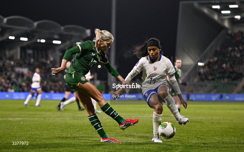 3 March 2026; Denise O'Sullivan of Republic of Ireland in action against Perle Morroni of France during the 2027 FIFA Women’s World Cup Qualifier match between Republic of Ireland and France at Tallaght Stadium in Dublin. Photo by Sam Barnes/Sportsfile
