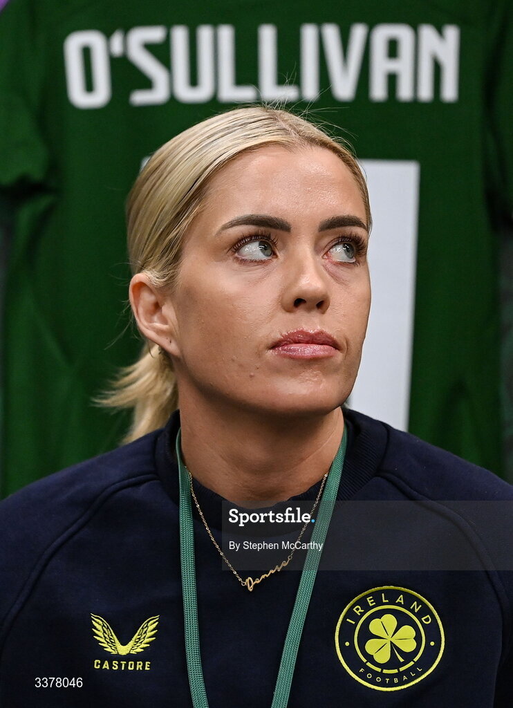 3 March 2026; Denise O’Sullivan of Republic of Ireland in their dressing room before the 2027 FIFA Women’s World Cup Qualifier match between Republic of Ireland and France at Tallaght Stadium in Dublin. Photo by Stephen McCarthy/Sportsfile