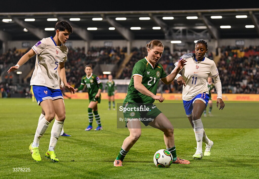 3 March 2026; Emily Murphy of Republic of Ireland in action against Kadidiatou Diani and Elisa De Almeida, left, of France during the 2027 FIFA Women’s World Cup Qualifier match between Republic of Ireland and France at Tallaght Stadium in Dublin. Photo by Stephen McCarthy/Sportsfile