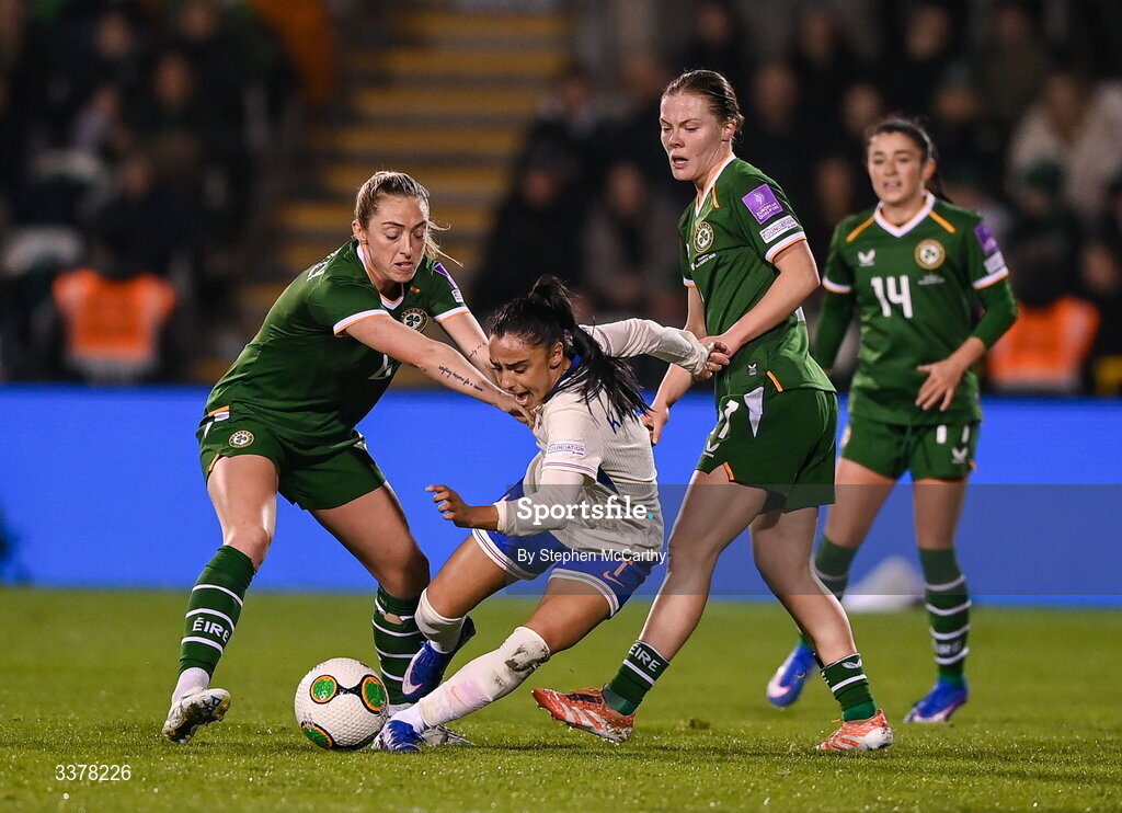 3 March 2026; Sakina Karchaoui of France in action against Megan Connolly of Republic of Ireland during the 2027 FIFA Women’s World Cup Qualifier match between Republic of Ireland and France at Tallaght Stadium in Dublin. Photo by Stephen McCarthy/Sportsfile