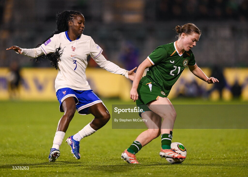 3 March 2026; Emily Murphy of Republic of Ireland in action against Thiniba Samoura of France during the 2027 FIFA Women’s World Cup Qualifier match between Republic of Ireland and France at Tallaght Stadium in Dublin. Photo by Stephen McCarthy/Sportsfile