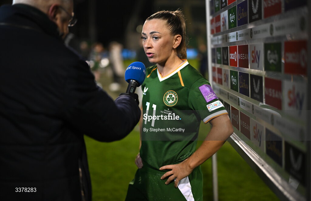 3 March 2026; Republic of Ireland captain Katie McCabe during an interview with RTÉ Sport after the 2027 FIFA Women’s World Cup Qualifier match between Republic of Ireland and France at Tallaght Stadium in Dublin. Photo by Stephen McCarthy/Sportsfile