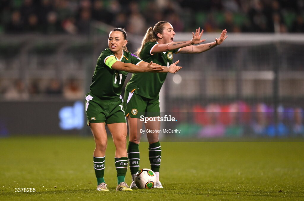 3 March 2026; Katie McCabe and Megan Connolly, right, of Republic of Ireland during the 2027 FIFA Women’s World Cup Qualifier match between Republic of Ireland and France at Tallaght Stadium in Dublin. Photo by Stephen McCarthy/Sportsfile