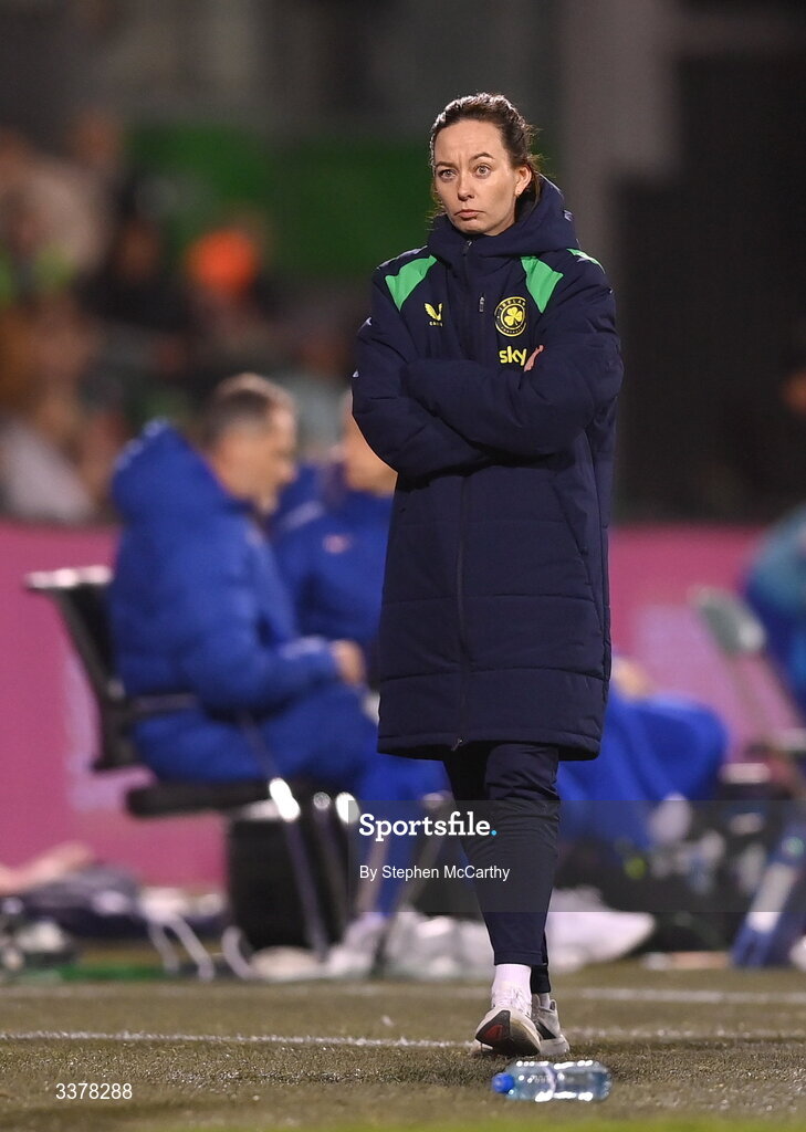 3 March 2026; Republic of Ireland assistant coach Amber Whiteley during the 2027 FIFA Women’s World Cup Qualifier match between Republic of Ireland and France at Tallaght Stadium in Dublin. Photo by Stephen McCarthy/Sportsfile