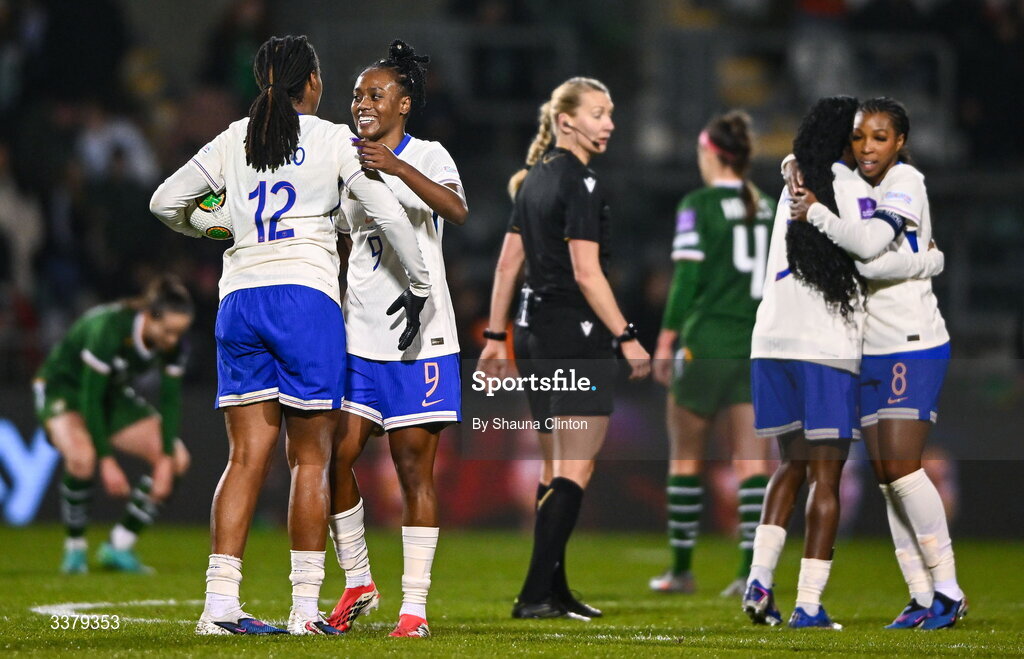 3 March 2026; France players Melvine Malard, right, and Marie-Antoinette Katoto after their side's victory inthe 2027 FIFA Women’s World Cup Qualifier match between Republic of Ireland and France at Tallaght Stadium in Dublin. Photo by Shauna Clinton/Sportsfile