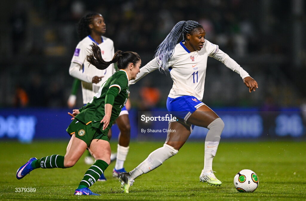 3 March 2026; Kadidiatou Diani of France in action against Marissa Sheva of Republic of Ireland during the 2027 FIFA Women’s World Cup Qualifier match between Republic of Ireland and France at Tallaght Stadium in Dublin. Photo by Shauna Clinton/Sportsfile
