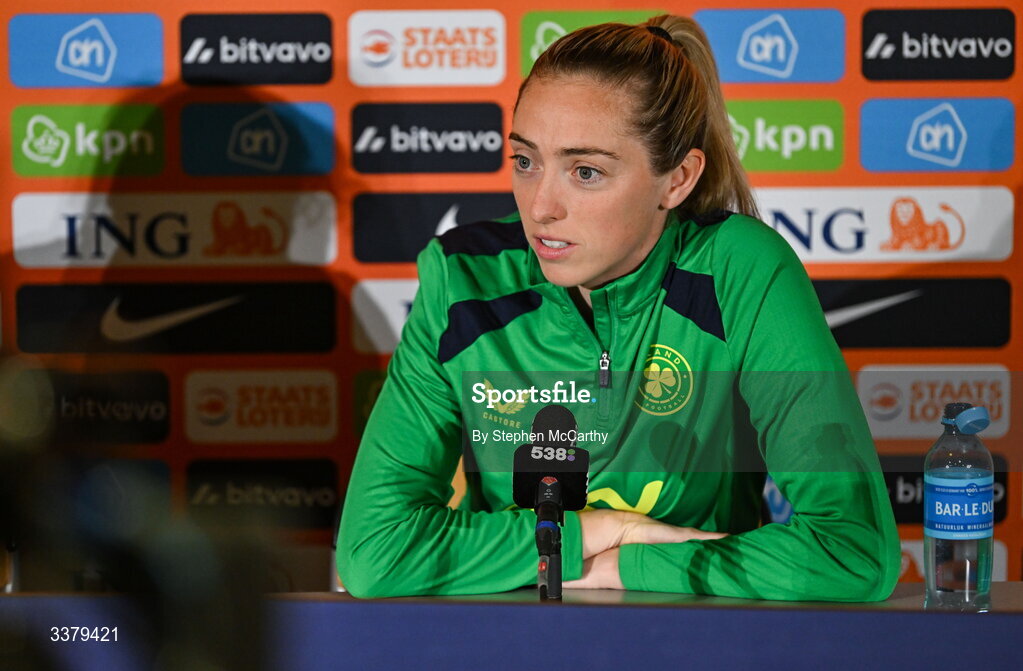 6 March 2026; Megan Connolly during a Republic of Ireland women's media conference at Stadion Galgenwaard in Utrecht, Netherlands. Photo by Stephen McCarthy/Sportsfile