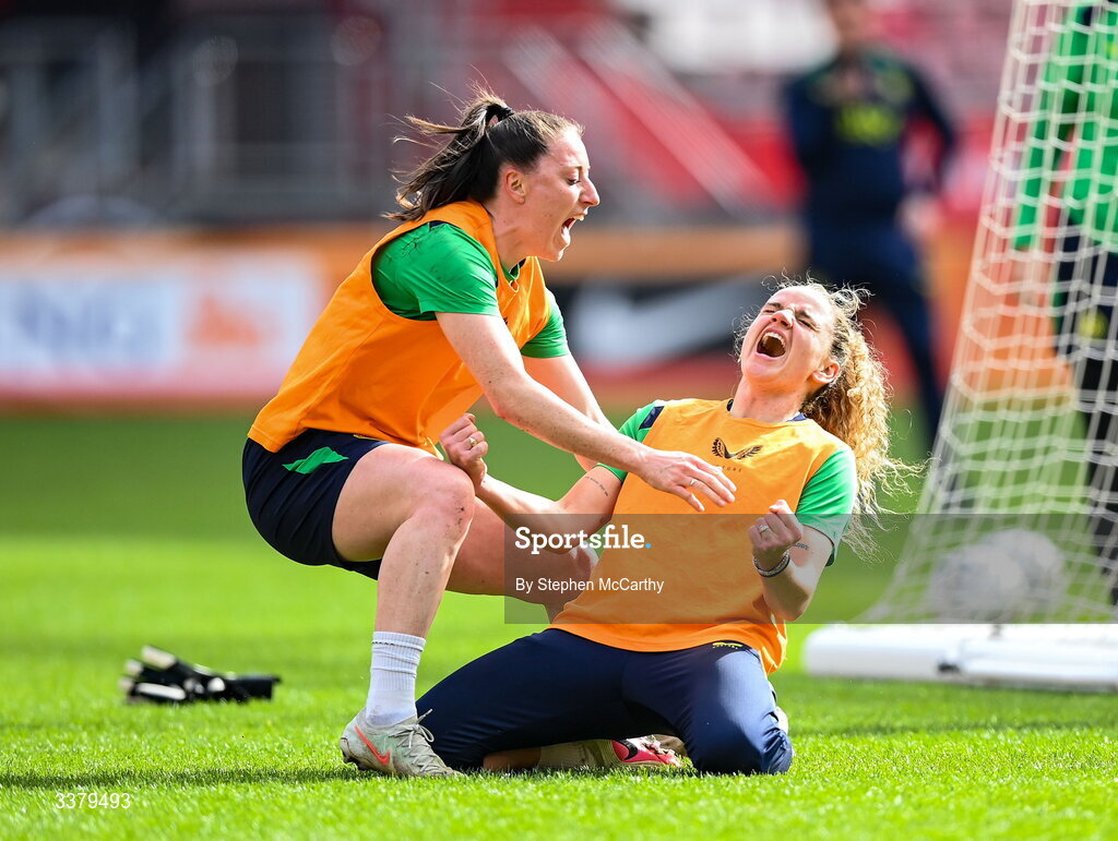 6 March 2026; Leanne Kiernan and Lucy Quinn, left, during a Republic of Ireland women's training session at Stadion Galgenwaard in Utrecht, Netherlands. Photo by Stephen McCarthy/Sportsfile