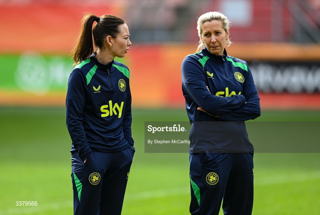 6 March 2026; Head coach Carla Ward, right, and assistant coach Amber Whiteley during a Republic of Ireland women's training session at Stadion Galgenwaard in Utrecht, Netherlands. Photo by Stephen McCarthy/Sportsfile