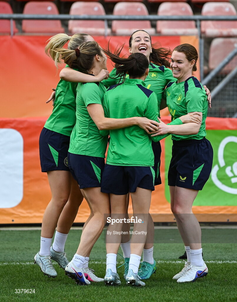 6 March 2026; Players, including Anna Patten and Aoife Mannion, right, celebrate during a Republic of Ireland women's training session at Stadion Galgenwaard in Utrecht, Netherlands. Photo by Stephen McCarthy/Sportsfile