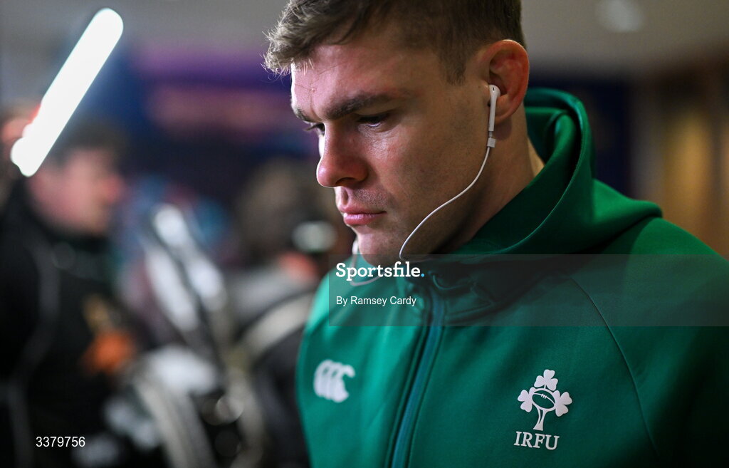 6 March 2026; Garry Ringrose of Ireland arrives ahead of the Guinness 6 Nations Rugby Championship match between Ireland and Wales at the Aviva Stadium in Dublin. Photo by Ramsey Cardy/Sportsfile
