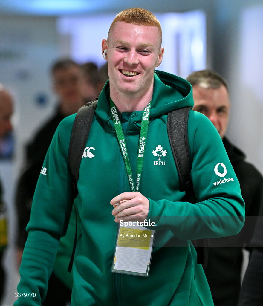 6 March 2026; Nathan Doak of Ireland arrives ahead of the Guinness 6 Nations Rugby Championship match between Ireland and Wales at the Aviva Stadium in Dublin. Photo by Brendan Moran/Sportsfile