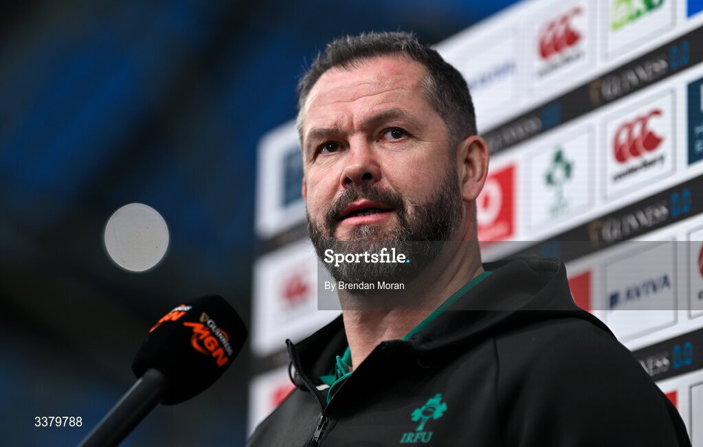 6 March 2026; Ireland head coach Andy Farrell is interviewed before the Guinness 6 Nations Rugby Championship match between Ireland and Wales at the Aviva Stadium in Dublin. Photo by Brendan Moran/Sportsfile