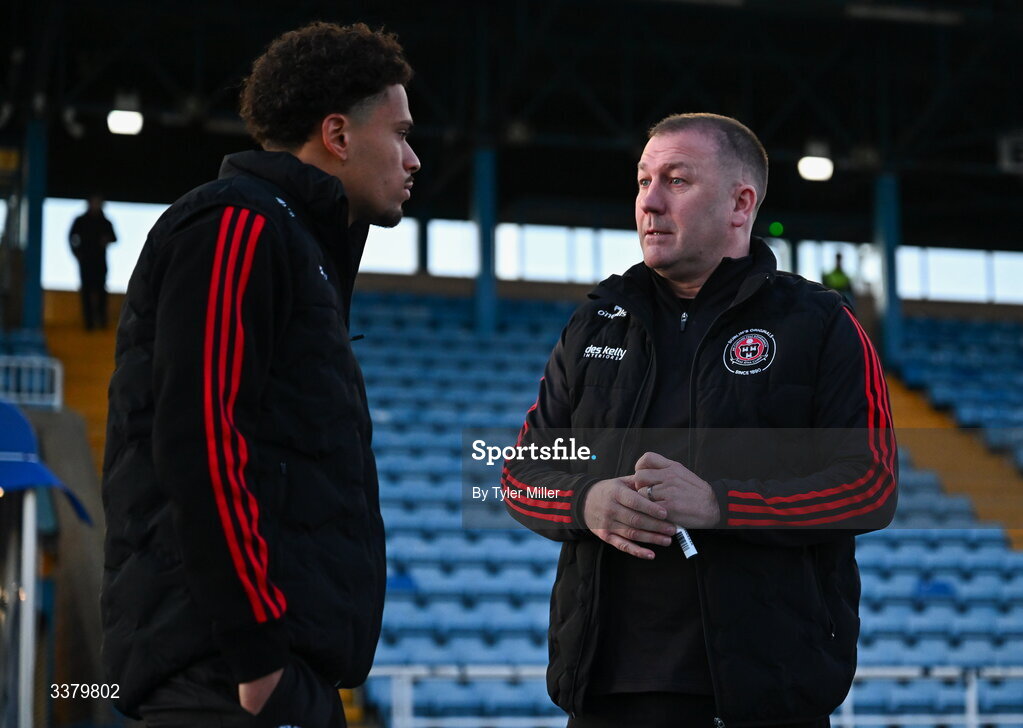 6 March 2026; Bohemians manager Alan Reynolds speaks with Zane Myers of Bohemians before the SSE Airtricity Men's Premier Division match between Waterford and Bohemians at the RSC in Waterford. Photo by Tyler Miller/Sportsfile