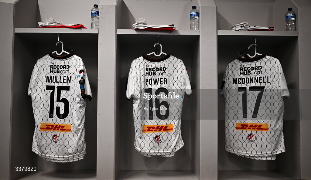 6 March 2026; The jerseys of from left, Senan Mullen, Darragh Power and Adam McDonnell hang in the Bohemians dressing room before during the SSE Airtricity Men's Premier Division match between Waterford and Bohemians at the RSC in Waterford. Photo by Tyler Miller/Sportsfile