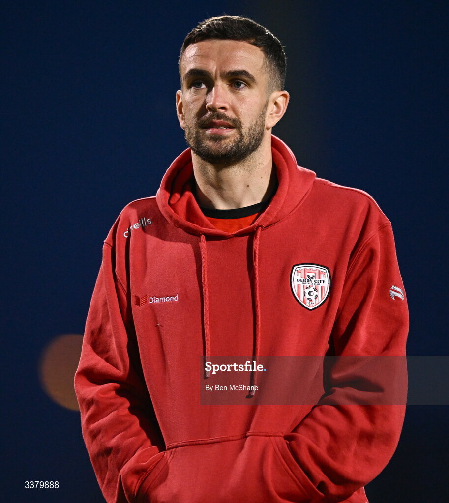 6 March 2026; Michael Duffy of Derry City before the SSE Airtricity Men's Premier Division match between Shamrock Rovers and Derry City at Tallaght Stadium in Dublin. Photo by Ben McShane/Sportsfile