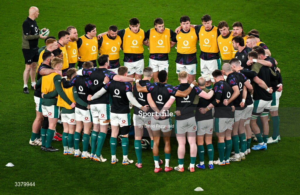 6 March 2026; Ireland players huddle before the Guinness 6 Nations Rugby Championship match between Ireland and Wales at the Aviva Stadium in Dublin. Photo by David Fitzgerald/Sportsfile