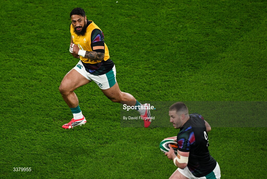 6 March 2026; Bundee Aki, left, and Stuart McCloskey of Ireland warms-up before the Guinness 6 Nations Rugby Championship match between Ireland and Wales at the Aviva Stadium in Dublin. Photo by David Fitzgerald/Sportsfile