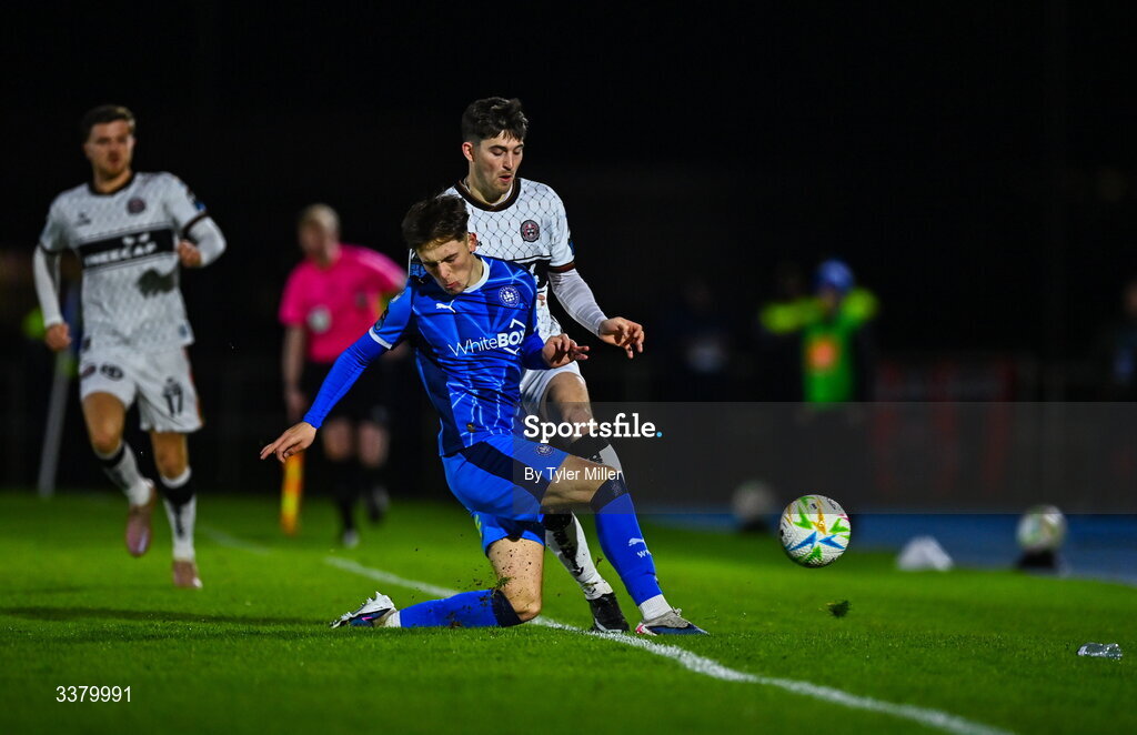 6 March 2026; Colm Whelan of Bohemians is tackled by Cian Barrett of Waterford during the SSE Airtricity Men's Premier Division match between Waterford and Bohemians at the RSC in Waterford. Photo by Tyler Miller/Sportsfile