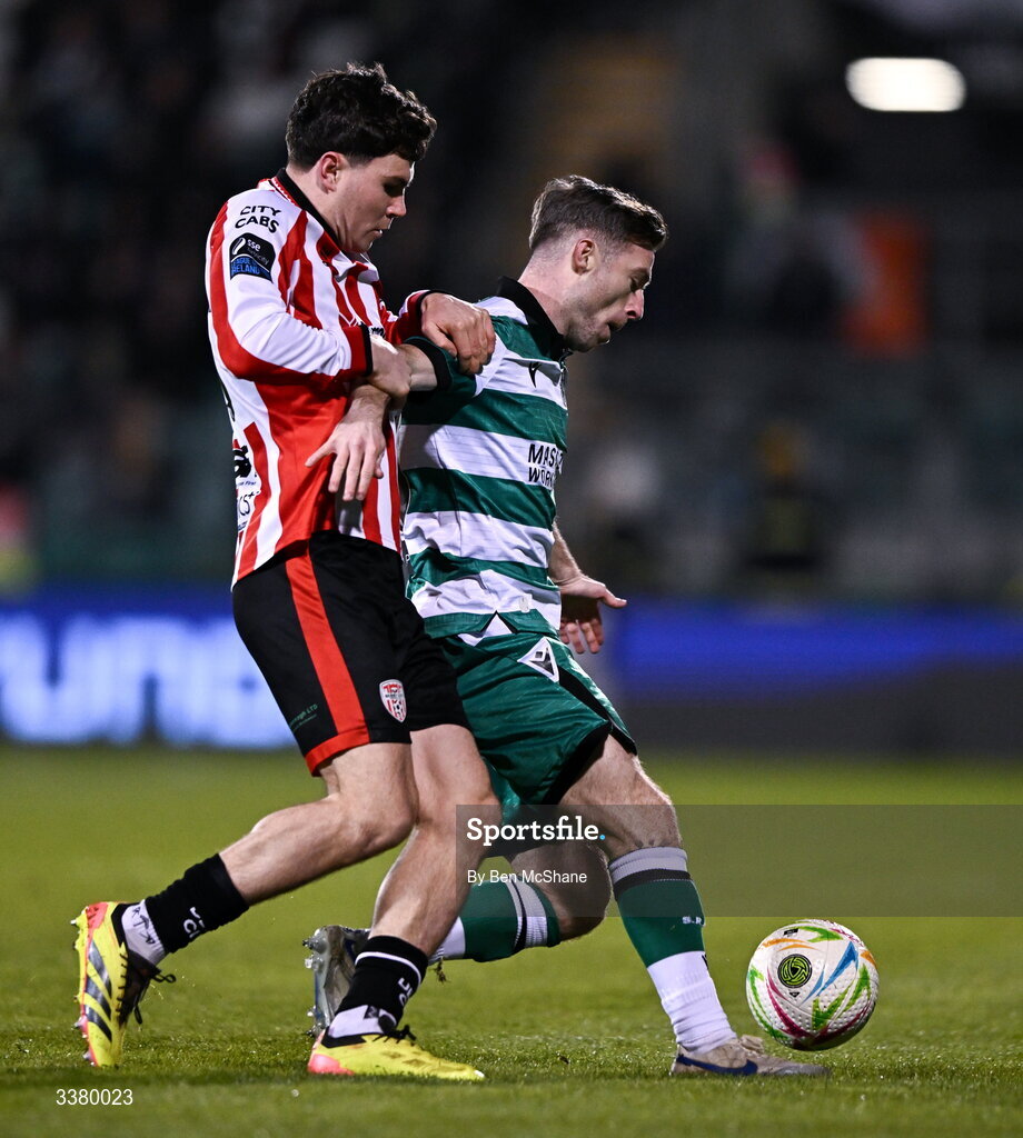 6 March 2026; Jack Byrne of Shamrock Rovers in action against James Clarke of Derry City during the SSE Airtricity Men's Premier Division match between Shamrock Rovers and Derry City at Tallaght Stadium in Dublin. Photo by Ben McShane/Sportsfile