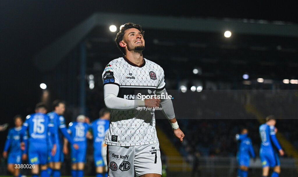 6 March 2026; Connor Parsons of Bohemians reacts during the SSE Airtricity Men's Premier Division match between Waterford and Bohemians at the RSC in Waterford. Photo by Tyler Miller/Sportsfile
