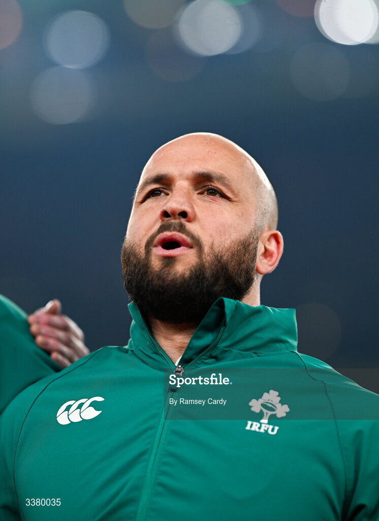 6 March 2026; Jamison Gibson-Park of Ireland stands for the national anthems ahead of the Guinness 6 Nations Rugby Championship match between Ireland and Wales at the Aviva Stadium in Dublin. Photo by Ramsey Cardy/Sportsfile