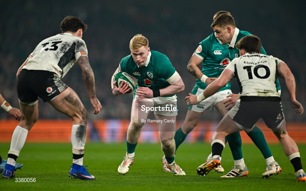 6 March 2026; Jamie Osborne of Ireland in action against Wales players Eddie James, left, and Dan Edwards during the Guinness 6 Nations Rugby Championship match between Ireland and Wales at the Aviva Stadium in Dublin. Photo by Ramsey Cardy/Sportsfile