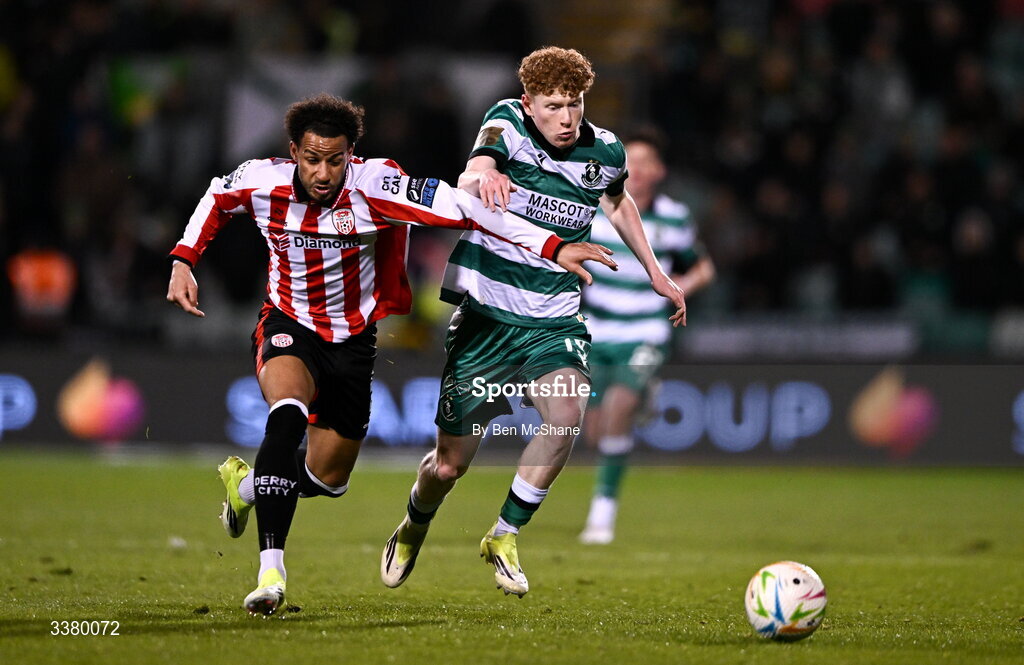 6 March 2026; Adam Brennan of Shamrock Rovers in action against Barry Cotter of Derry City during the SSE Airtricity Men's Premier Division match between Shamrock Rovers and Derry City at Tallaght Stadium in Dublin. Photo by Ben McShane/Sportsfile