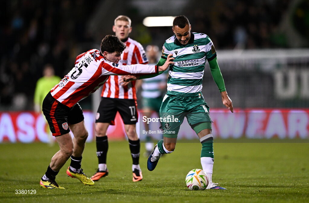 6 March 2026; Graham Burke of Shamrock Rovers in action against James Clarke of Derry City during the SSE Airtricity Men's Premier Division match between Shamrock Rovers and Derry City at Tallaght Stadium in Dublin. Photo by Ben McShane/Sportsfile