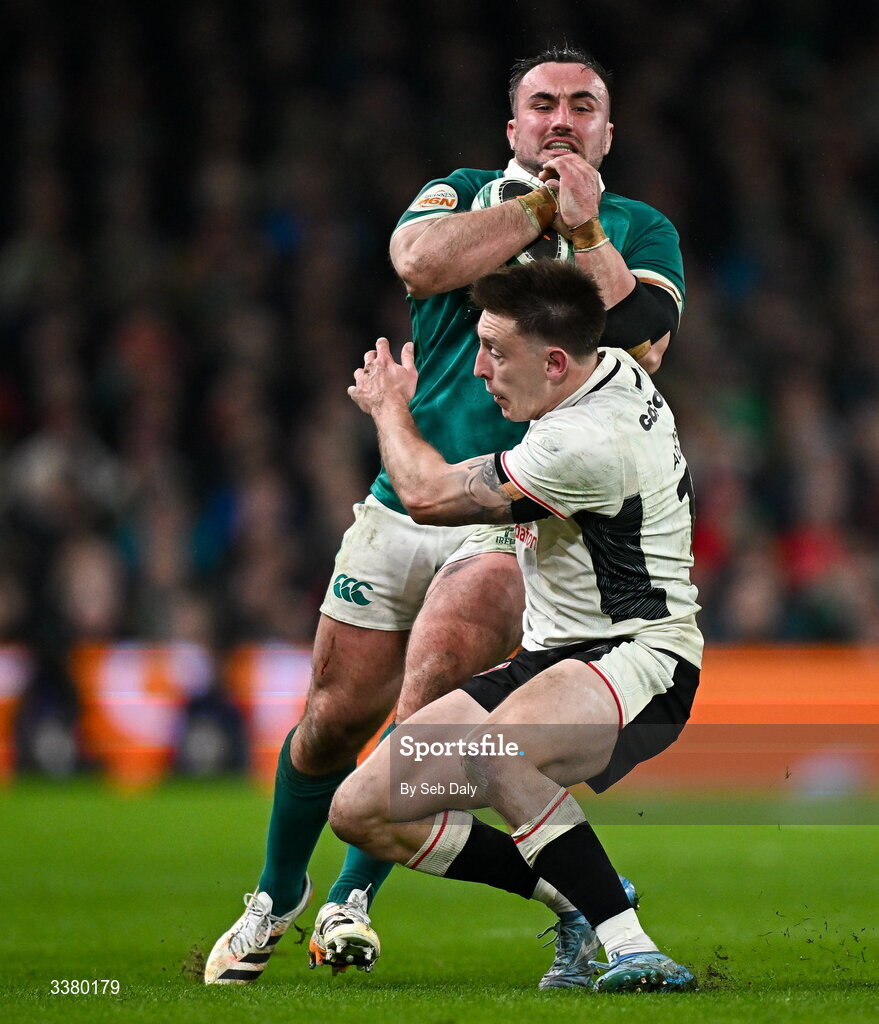 6 March 2026; Rónan Kelleher of Ireland is tackled by Josh Adams of Wales during the Guinness 6 Nations Rugby Championship match between Ireland and Wales at the Aviva Stadium in Dublin. Photo by Seb Daly/Sportsfile
